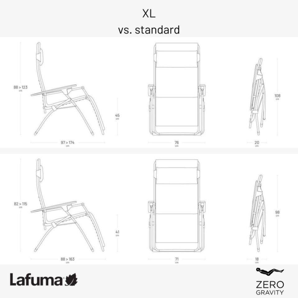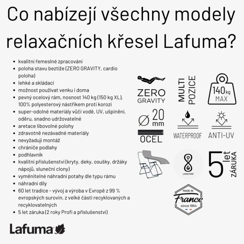 Všetky sklopné stoličky Lafuma ponúkajú polohu ZERO GRAVITY, ktorá rovnomerne rozloží telesnú hmotnosť, odľahčí chrbticu, chrbát, nohy a krčnú chrbticu a zlepšuje krvný obeh. Sú určené na dlhodobé používanie doma aj vonku.