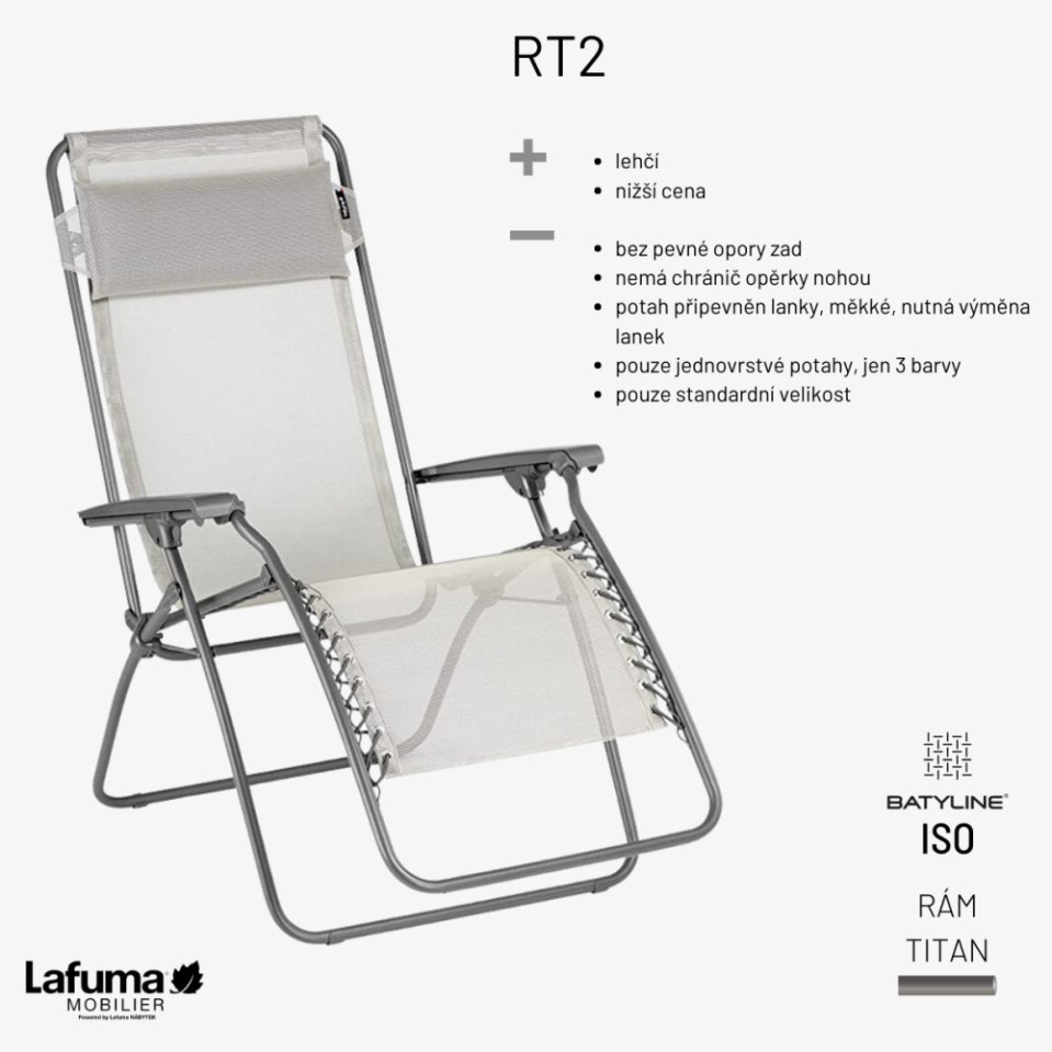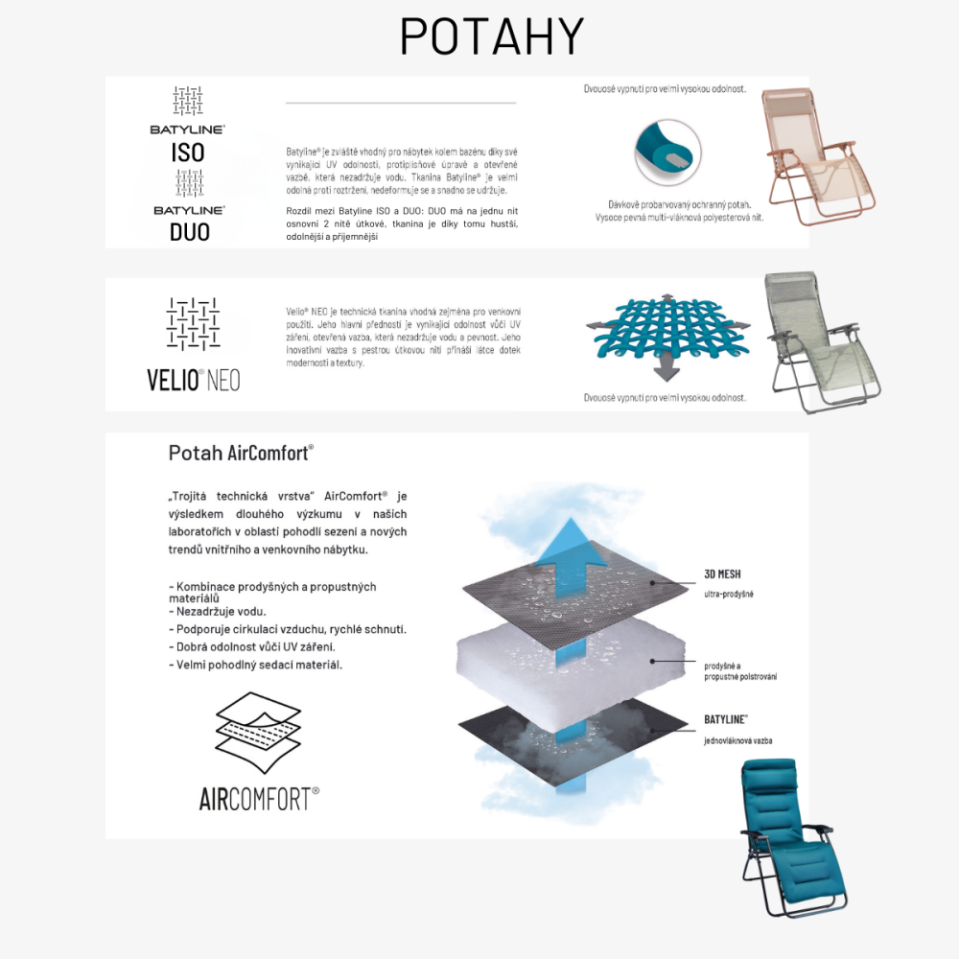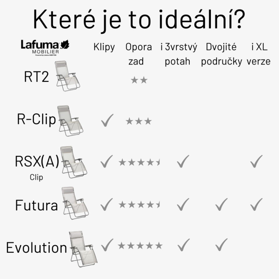 - Zvolte si konstrukci: Lafuma nabízí několik typů rámů, hlavní rozdíl je kromě velikosti i v počtu úchytů zavěšení potahu na rám, řešení područek a s tím spojené míře komfortu.