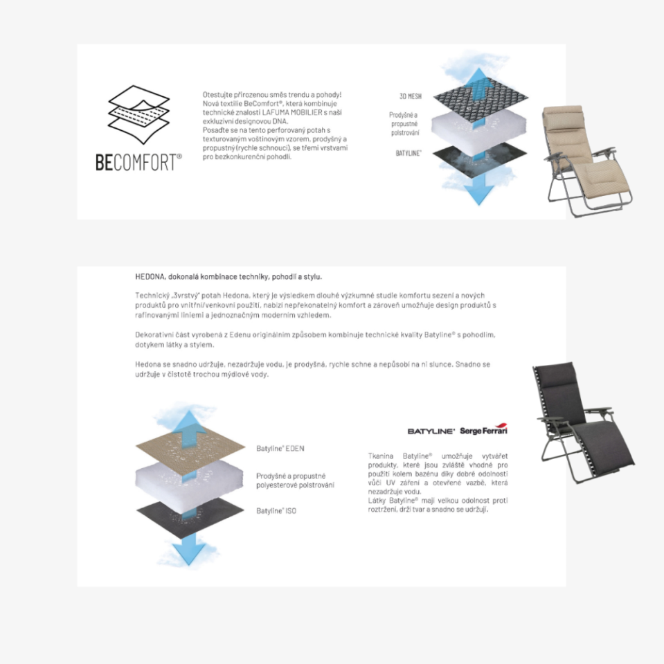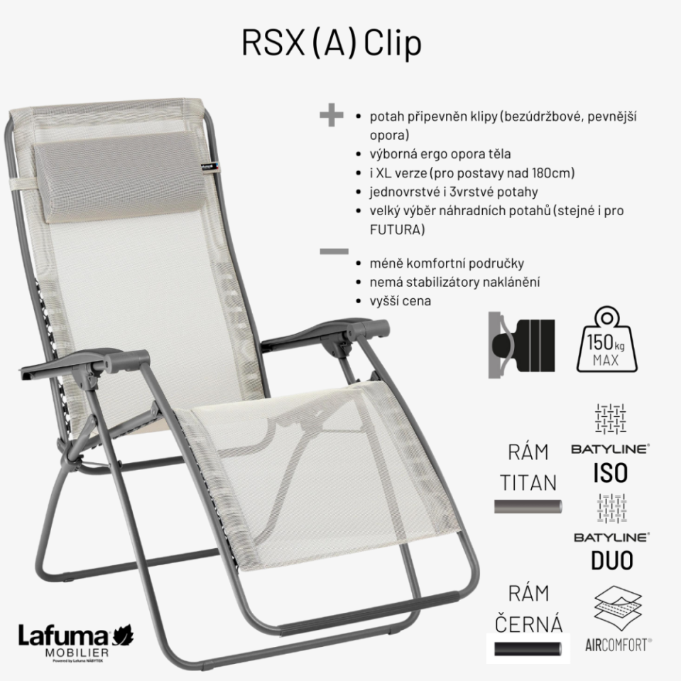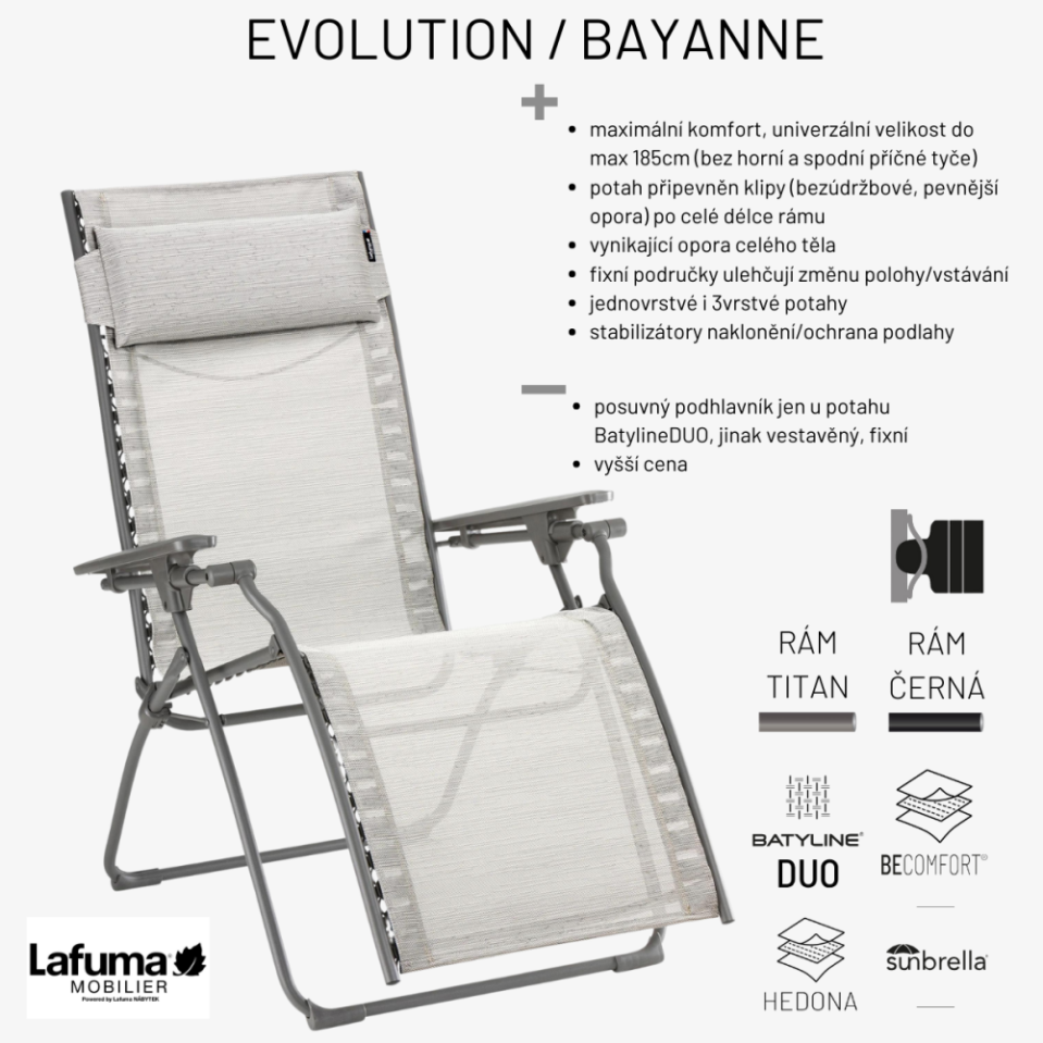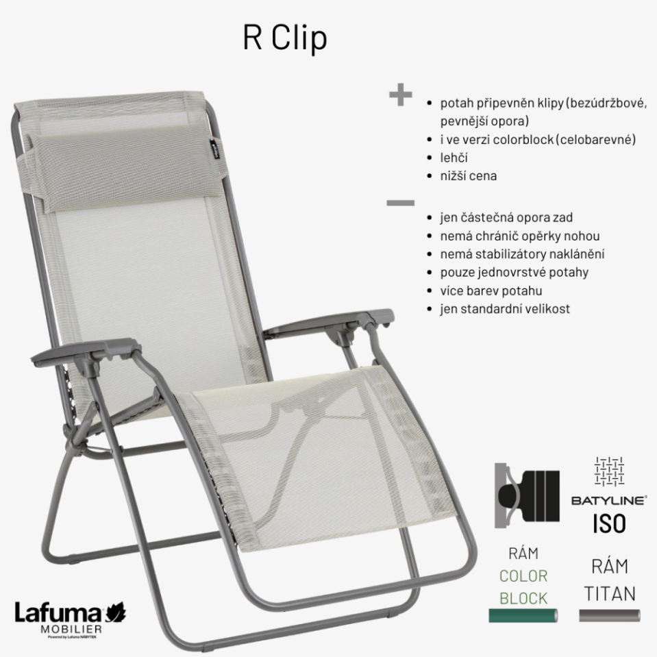 - Zvolte si konstrukci: Lafuma nabízí několik typů rámů, hlavní rozdíl je kromě velikosti i v počtu úchytů zavěšení potahu na rám, řešení područek a s tím spojené míře komfortu.