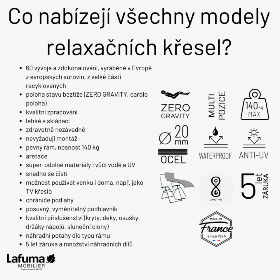 Vyberte si Lafuma křeslo a užijte si díky 5 leté záruce a opravitelnosti pohodlí a relaxaci po celý život. Křeslo Lafuma se stane vaším věrným společníkem pro všechny chvíle odpočinku a pohody.