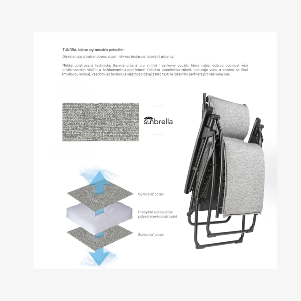 Hlavní výhodou našeho zahradního relaxačního křesla Lafuma MOBILIER je naprosto jedinečný komfort, který poskytuje. Manuálně sklopné opěradlo se bez námahy posouvá ze vzpřímené polohy do polohy nulové gravitace, která je považována za ideální polohu těla. Ležení v úhlu 127 stupňů je ideální pro zlepšení krevního oběhu a odlehčení zad, nohou a krku. Látka je chytře připevněna tak, aby dokonale podpírala vaše záda a přinášela ideální rozložení váhy vašeho těla. Zklidňuje tlakové body těla a nastavitelný nebo integrovaný podhlavník jemně podpírá krk.