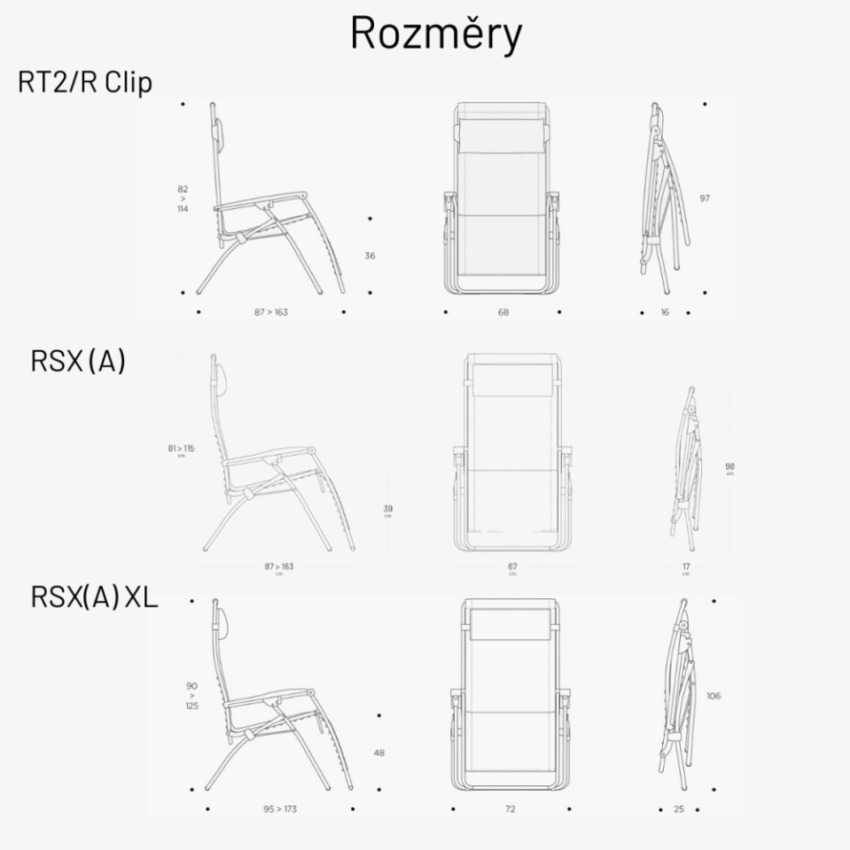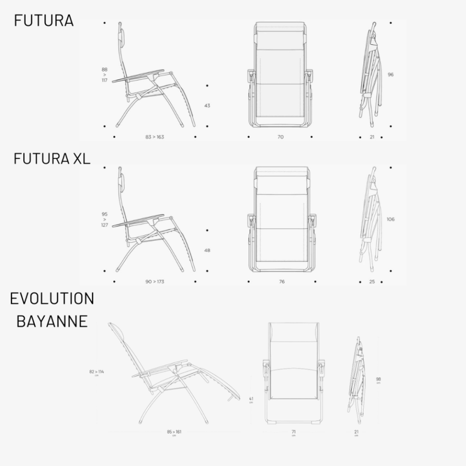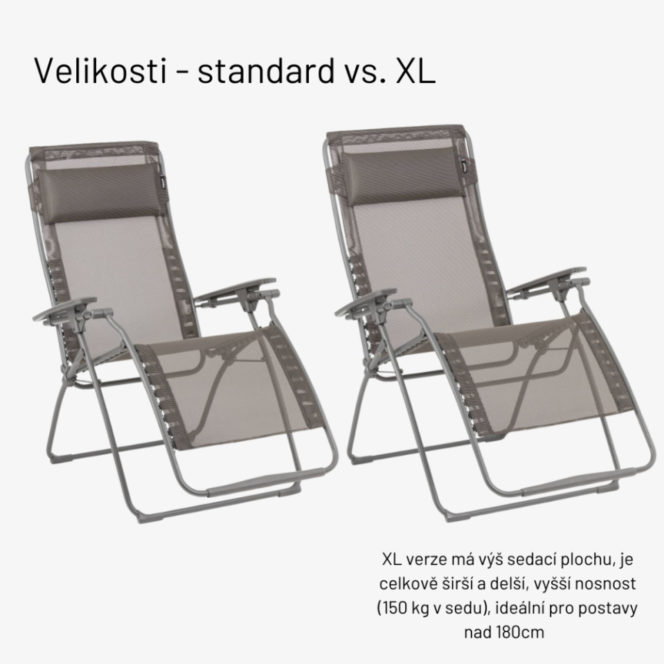 - Vyberte si velikost: Křesla Lafuma jsou dostupná ve dvou velikostech, verze XL je vyšší a širší a je vhodná pro osoby nad 180cm .